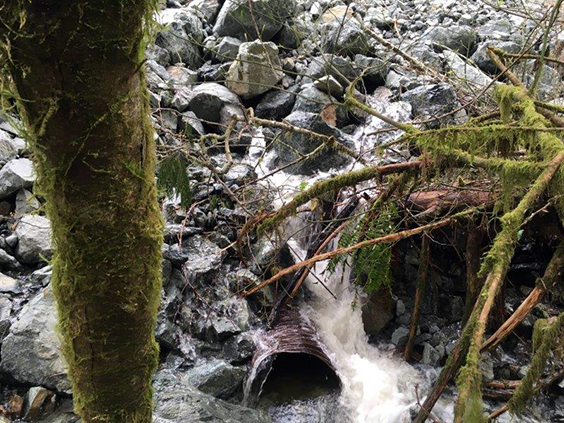 Skagit County required the design of a replacement culvert located on Harrison Creek under a county road for upstream fish passage. The existing corrugated metal pipe culvert is undersized and failing, and water is seeping around it through the Colony Mountain Road prism during high flows. A second, larger culvert had been recently installed at a higher elevation to provide interim high-flow relief. These culverts were to be replaced with a single, larger culvert that met Washington Department of Fish & Wildlife and NOAA Fisheries fish passage criteria.