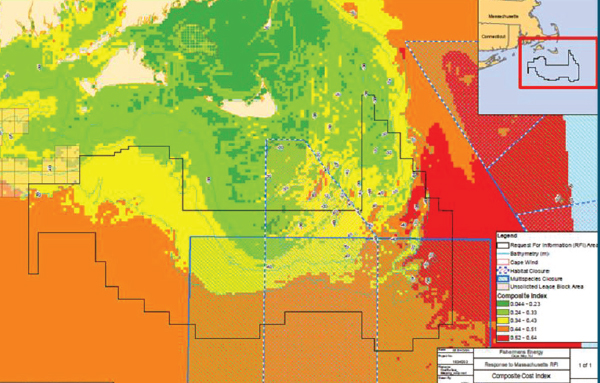 Kleinschmidt worked with Fishermen’s Energy to prepare responses to BOEM for WEAs in Massachusetts, New Jersey, Rhode Island, and Virginia. An important component of each of these responses was a detailed GIS evaluation of the areas in question, including environmental and engineering appraisal using geospatial analysis and other GIS tools, to identify the optimum choice of OCS blocks for development. Kleinschmidt developed a spatial decision-support system that incorporated a wide array of publicly available information. Kleinschmidt’s geospatial data scientists processed the raw data to produce derived products such as engineering cost, ecological diversity, and least-coast pathways for transmitting electricity. The derived layers were then combined to form a wind-farm suitability map that assisted in determining the most effective location for wind power development.